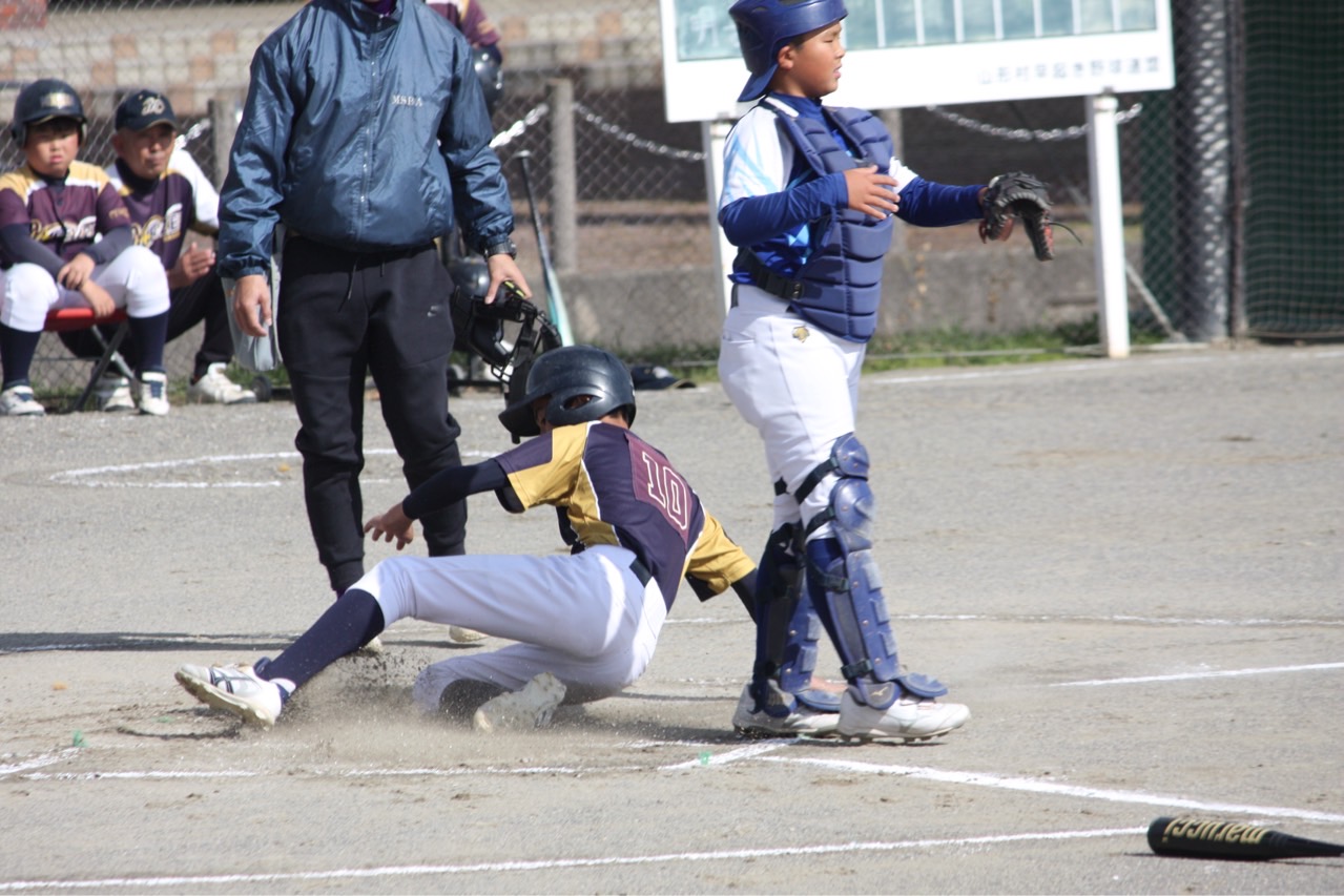 しょうま、ホームインで3点目、えいまもホームを狙うが、返球アウトで2アウトに。